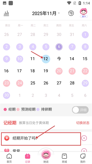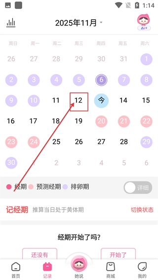 2、在記錄頁面的日歷中,選擇需要記錄經期的日期,如2025年11月12日。