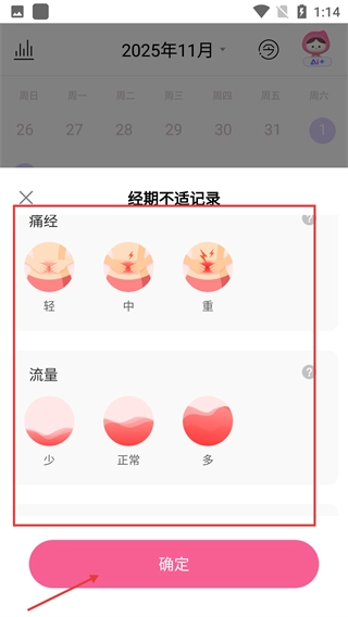 4、在經期不適記錄頁面,選擇痛經程度和流量情況后點擊【確定】,完成經期記錄。