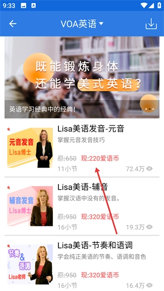 3、在學(xué)習(xí)內(nèi)容界面選擇課程,如【Lisa美語發(fā)音-元音】。