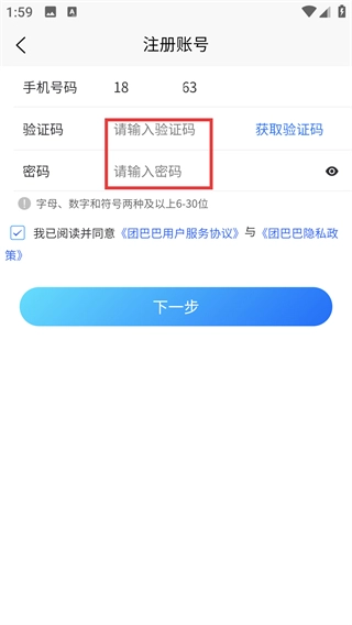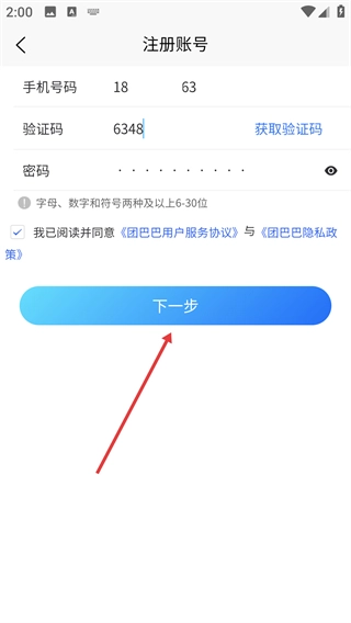 3、點擊“獲取驗證碼”,輸入收到的驗證碼;設置符合要求的密碼(字母、數(shù)字和符號兩種及以上,6-30位)。