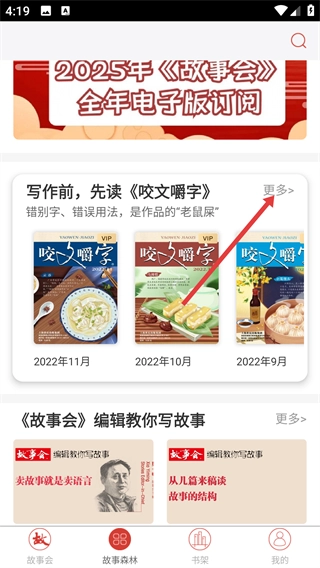 2、在【故事森林】頁面,找到【寫作前-先讀《咬文嚼字》】板塊,點(diǎn)擊【更多】按鈕,查看該板塊完整內(nèi)容列表。