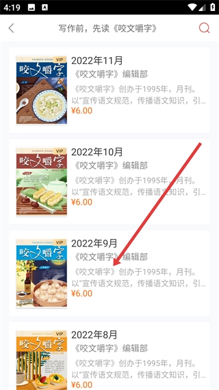 3、在《咬文嚼字》列表中,點(diǎn)擊目標(biāo)期刊條目,如【2022年9月-《咬文嚼字》】,進(jìn)入期刊詳情頁面。