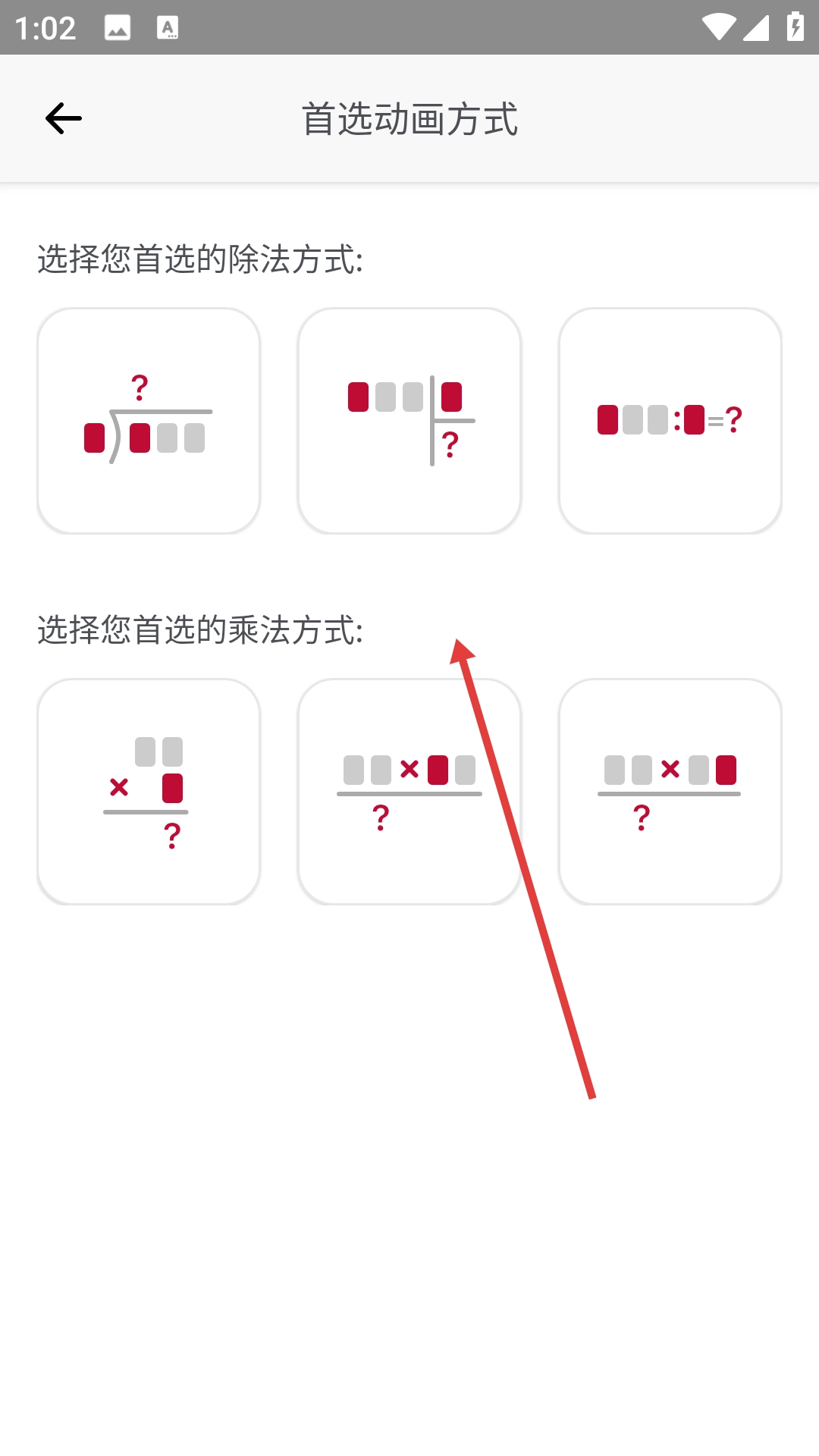 4、在首選動(dòng)畫方式設(shè)置頁(yè)面選擇偏好的除法和乘法動(dòng)畫方式,完成動(dòng)畫方式的設(shè)置操作。