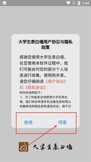 首次使用大學(xué)生表白墻時(shí),需要點(diǎn)擊【同意】按鈕,在同意用戶協(xié)議和隱私政策后才能進(jìn)入界面。