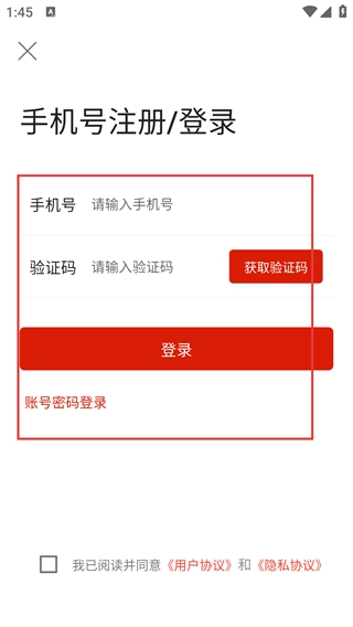 3、在手機(jī)號(hào)注冊(cè)/登錄頁面,可選擇短信登錄,輸入手機(jī)號(hào)和驗(yàn)證碼后點(diǎn)擊【登錄】。