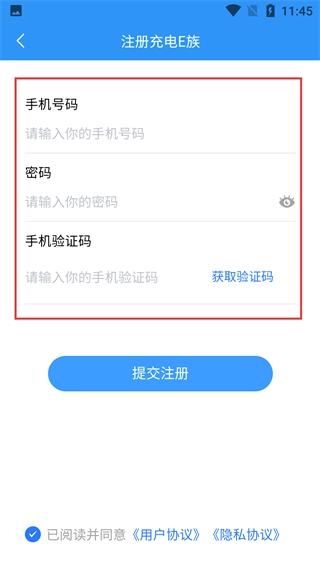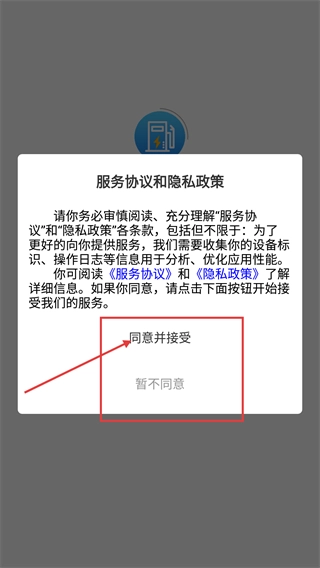 1、啟動(dòng)充電E族后,點(diǎn)擊“同意并接受”按鈕,以接受服務(wù)協(xié)議與隱私政策,隨后即可進(jìn)入使用流程。