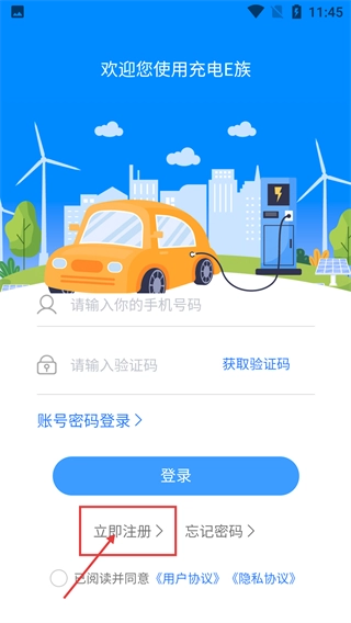 2、在登錄頁面,點(diǎn)擊“立即注冊(cè)”,進(jìn)入注冊(cè)充電E族流程。