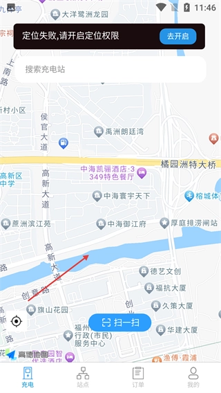 4、進(jìn)入充電頁面,可在地圖上搜索充電站,若定位失敗,點(diǎn)擊“去開啟”開啟定位權(quán)限,以便精準(zhǔn)查找附近充電站.