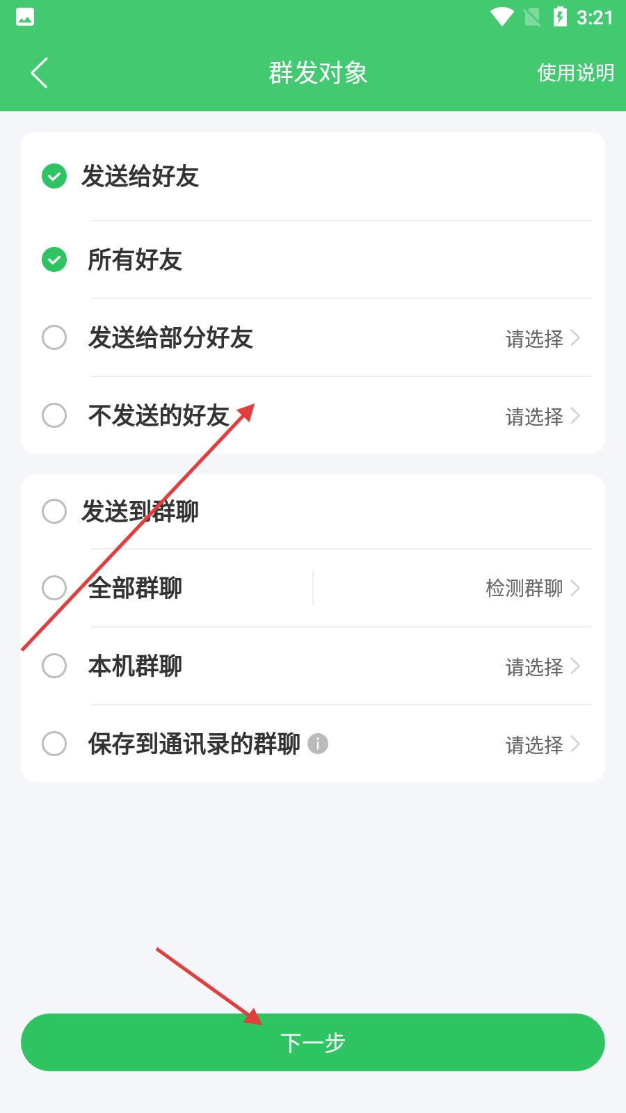 2、在群發(fā)對象界面,可選擇發(fā)送給好友、群聊等不同對象,選擇后點(diǎn)擊【下一步】。