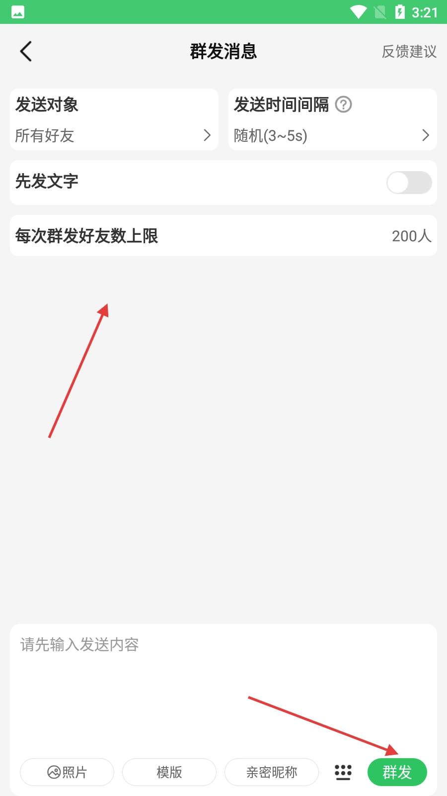 3、可設(shè)置發(fā)送對象、發(fā)送時(shí)間間隔、先發(fā)文字等選項(xiàng),輸入發(fā)送內(nèi)容后點(diǎn)擊【群發(fā)】按鈕即可完成群發(fā)操作。