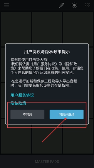 1、在用戶協(xié)議與隱私政策的提示界面,點擊【同意并繼續(xù)】按鈕,即可進入打擊墊大師的主界面。