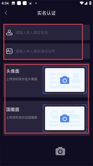 4、在實(shí)名認(rèn)證界面輸入真實(shí)姓名、身份證號(hào),上傳身份證頭像面和國(guó)徽面,完成實(shí)名認(rèn)證操作。