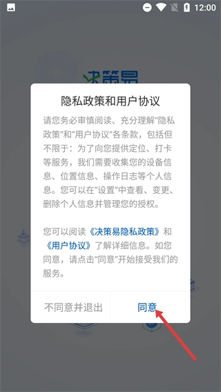 在【隱私政策和用戶協(xié)議】彈窗內(nèi),需仔細閱讀相關(guān)內(nèi)容后點擊【同意】按鈕,才能繼續(xù)使用決策易軟件。