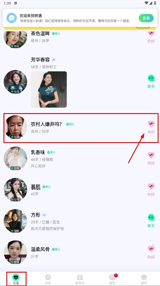 1、在交友頁面,點擊你感興趣的用戶(例如顯示為【農(nóng)村人嫌棄嗎?-用戶名稱】的用戶),即可進入該用戶的個人主頁。