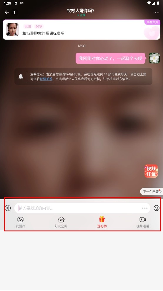 3、在聊天界面,可輸入內(nèi)容發(fā)送,還能使用發(fā)圖片、送禮物等功能。