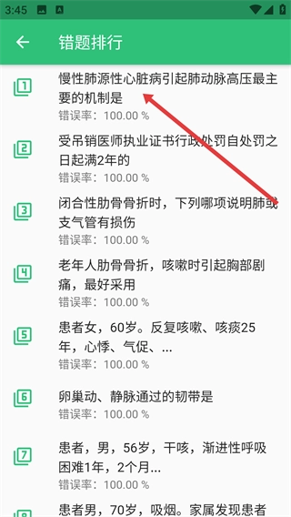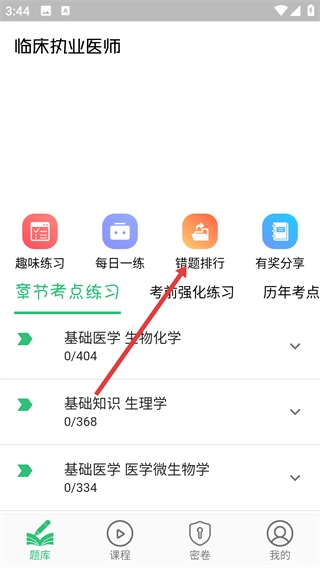 1、進(jìn)入【臨床執(zhí)業(yè)醫(yī)師】題庫(kù)界面后,點(diǎn)擊【錯(cuò)題排行】功能,即可查看個(gè)人錯(cuò)題情況,這有助于進(jìn)行針對(duì)性復(fù)習(xí)。
