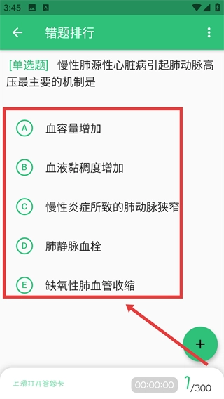 3、進(jìn)入錯(cuò)題詳情后,可查看題目選項(xiàng),如【慢性肺源性心臟病引起肺動(dòng)脈高壓最主要的機(jī)制是】的多個(gè)選項(xiàng),回顧答題過程。