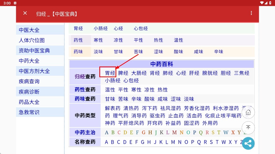 2、在頁面找到【胃經(jīng)-經(jīng)絡(luò)選項】并點擊,查看歸入胃經(jīng)的中藥列表。