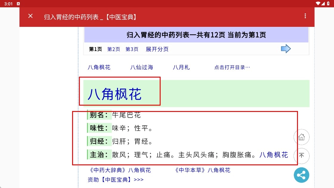 4、點擊具體中藥名稱,如【八角楓花-中藥名稱】,可查看其別名、味性、歸經(jīng)、主治等詳細(xì)信息。