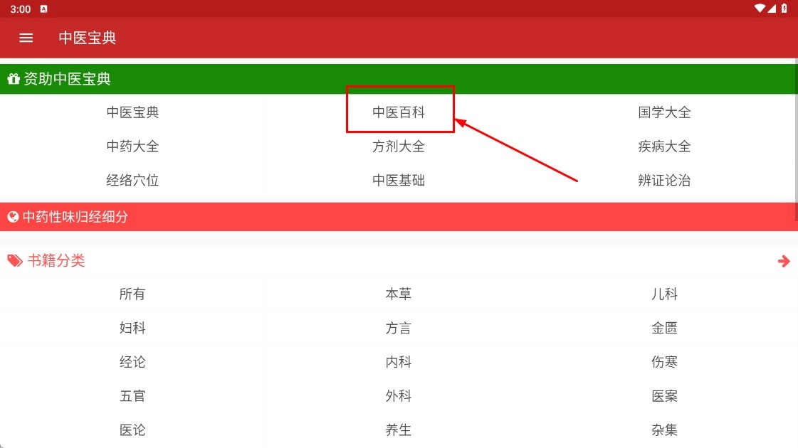 1、點擊【中醫(yī)百科-分類按鈕】,進入中醫(yī)百科頁面。