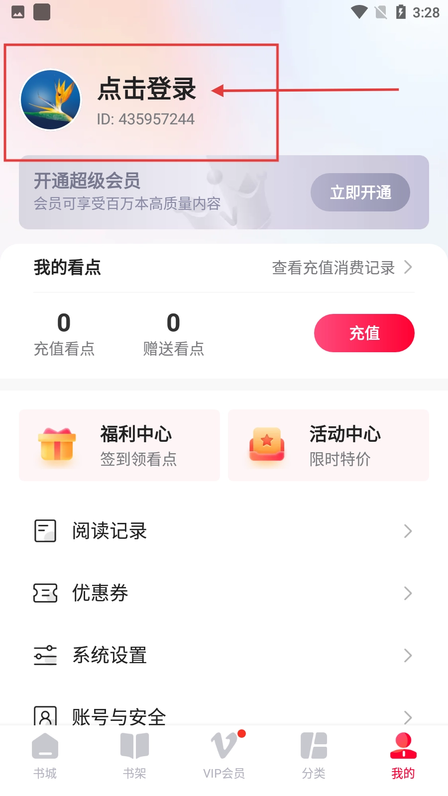在小說(shuō)軟件的書(shū)城界面,點(diǎn)擊右下角的【我的】按鈕,就能進(jìn)入個(gè)人中心界面。