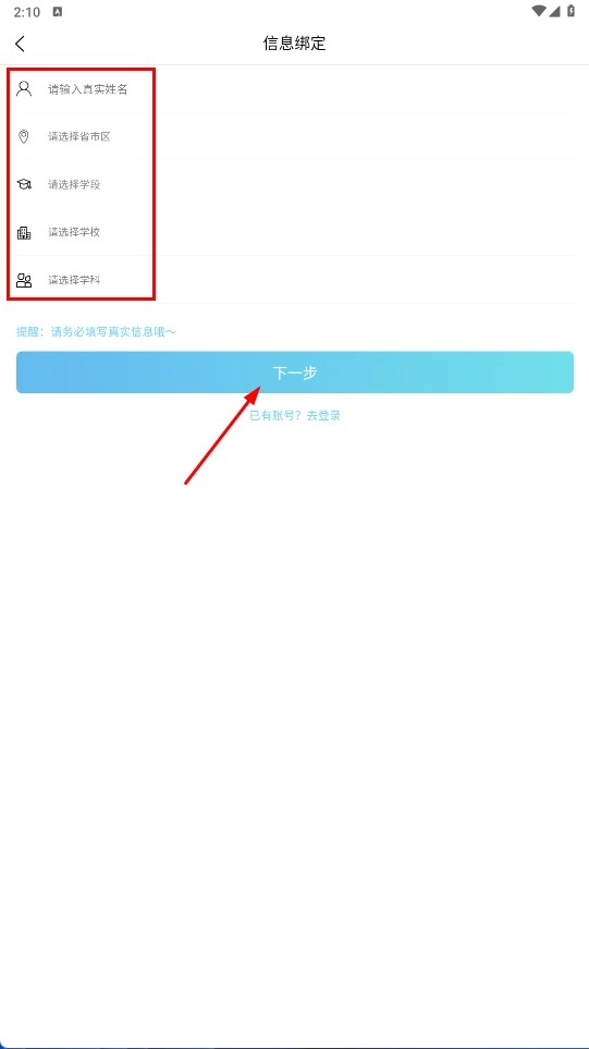 2、在信息綁定界面,輸入真實姓名、選擇省市、學(xué)段、學(xué)校、學(xué)科后,點擊【下一步-功能按鈕】。