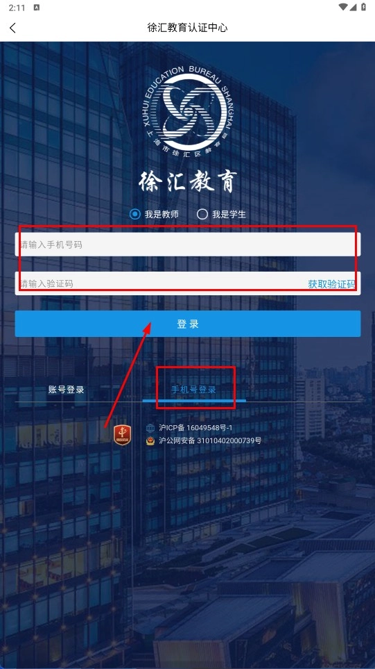 3、在徐匯教育認(rèn)證中心賬號登錄界面,選擇身份(我是教師/我是學(xué)生),輸入登錄賬號、密碼和驗證碼后,點擊【登錄-功能按鈕】。