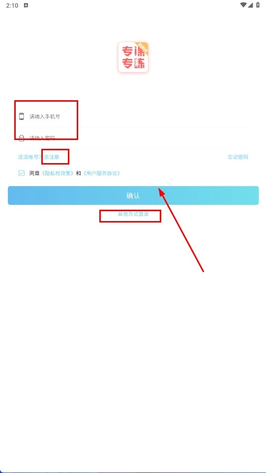 1、在登錄注冊界面,輸入手機(jī)號與密碼后,點擊【確認(rèn)】功能按鈕即可登錄;若需注冊,可點擊【去注冊】選項;此外,還能選擇【其他方式登錄】。