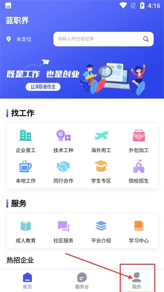 1、打開(kāi)【藍(lán)職界】的首頁(yè)后,點(diǎn)擊頁(yè)面底部的【我的】選項(xiàng),即可進(jìn)入用于管理個(gè)人求職信息的個(gè)人中心頁(yè)面。