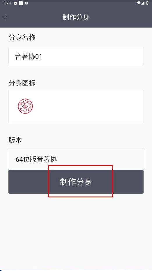 3、進入應(yīng)用分身設(shè)置頁,確認分身名稱、圖標等信息后,點擊【制作分身-功能按鈕】。
