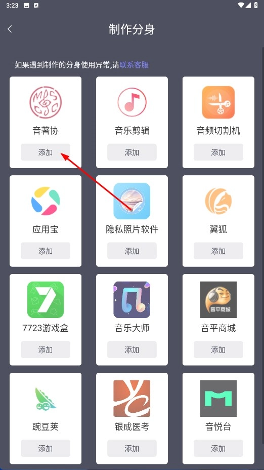 2、在制作分身頁面,選擇要創(chuàng)建分身的應(yīng)用,如【音著協(xié)-應(yīng)用圖標】并點擊添加。