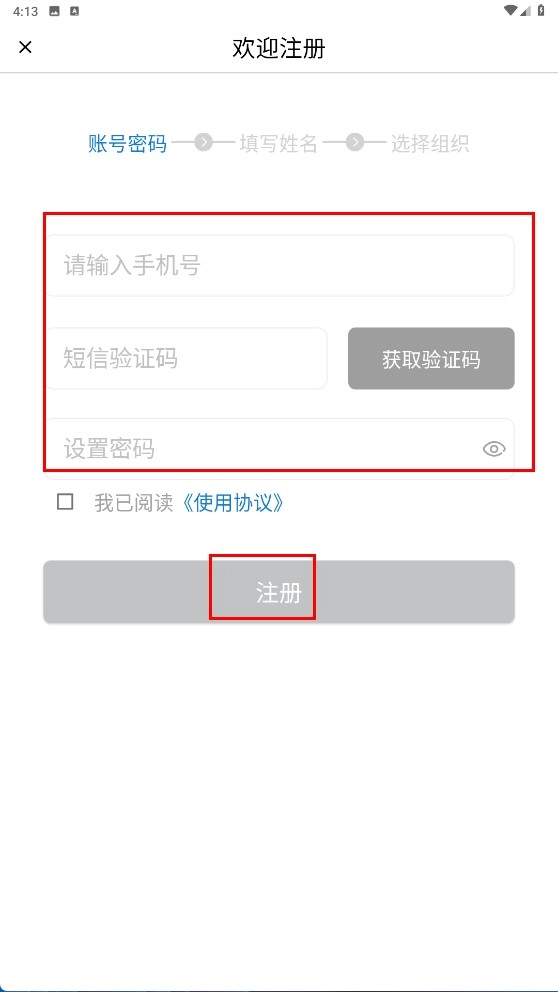 2、進入注冊頁,輸入【手機號】,獲取并填寫【短信驗證碼】,設置密碼后點擊注冊按鈕。
