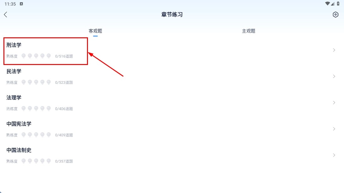 2、在章節(jié)練習頁面選擇【刑法學-學科分類】,進入刑法學題目練習。