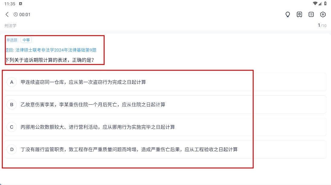 3、在刑法學題目頁,可查看題目并選擇答案,如關(guān)于追訴期限計算的單選題。