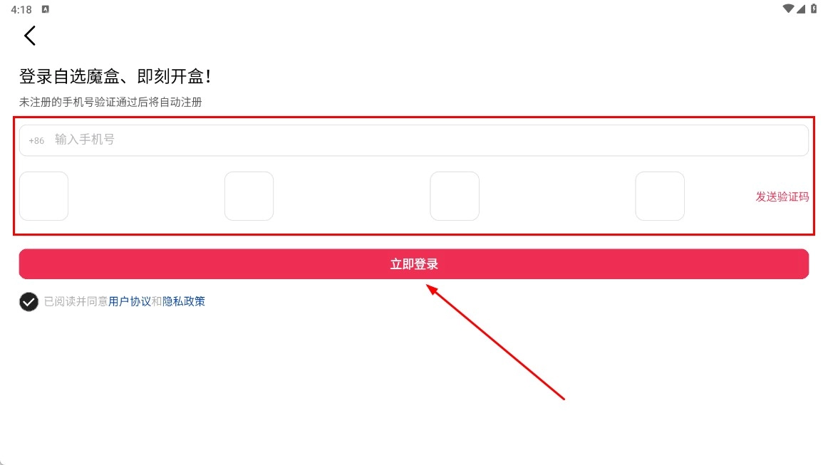 2、在登錄頁(yè)面輸入手機(jī)號(hào)和驗(yàn)證碼,點(diǎn)擊【立即登錄-功能按鈕】完成登錄。