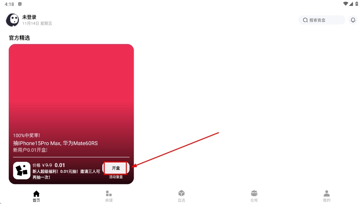 3、登錄后在首頁(yè),點(diǎn)擊【開(kāi)盒-功能按鈕】,參與新人福利抽獎(jiǎng)活動(dòng)。