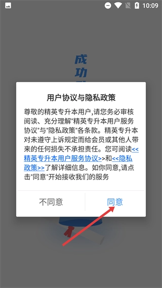1、使用服務(wù)前,請(qǐng)務(wù)必閱讀《精英專升本用戶服務(wù)協(xié)議》與《隱私政策》,在充分了解相關(guān)條款內(nèi)容后點(diǎn)擊【同意】,即可正式啟用服務(wù)。