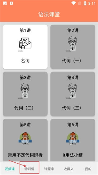 在語(yǔ)法學(xué)習(xí)軟件里,點(diǎn)擊底部的【特訓(xùn)營(yíng)】按鈕,就能進(jìn)入語(yǔ)法練習(xí)板塊。
