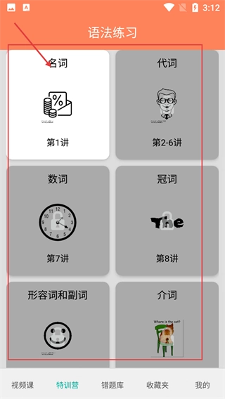2、在語(yǔ)法練習(xí)板塊,選擇【名詞】專(zhuān)題,進(jìn)入名詞練習(xí)頁(yè)面。