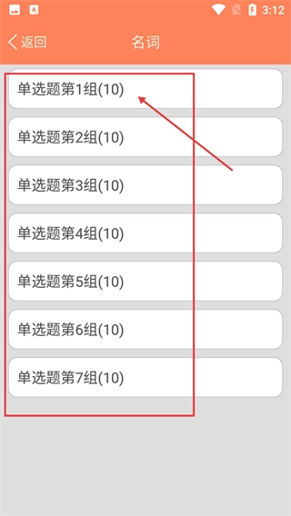 3、在名詞練習(xí)頁(yè)面,選擇【單選題第1組(10)】,開(kāi)始名詞單選題練習(xí)。