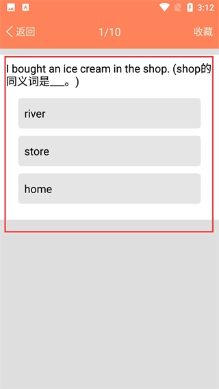 4、單選題練習(xí)中,根據(jù)題目要求選擇正確答案,如本題中shop的同義詞是store,可選擇該選項(xiàng)完成答題。