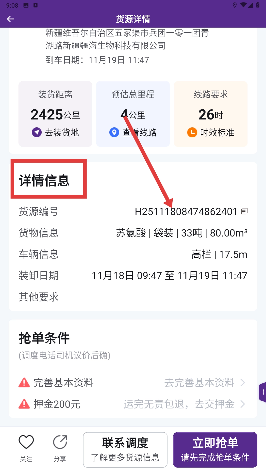 3、在貨源詳情頁,可瀏覽裝貨卸貨時間、地點、里程等信息,點擊【立即搶單-功能按鈕】(需先完成搶單條件)。