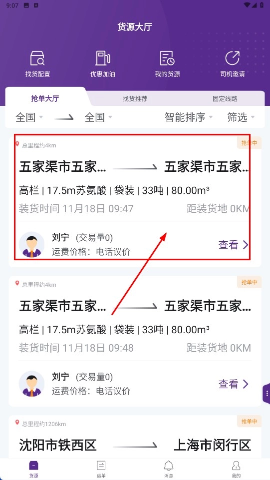 2、進入貨源大廳,點擊感興趣的貨源卡片,如【五家渠市-貨源卡片】,查看貨源詳情。