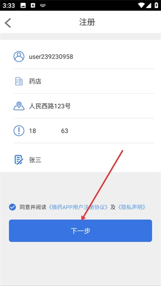 4、勾選同意協(xié)議后,點擊【下一步】按鈕,完成注冊信息提交操作。