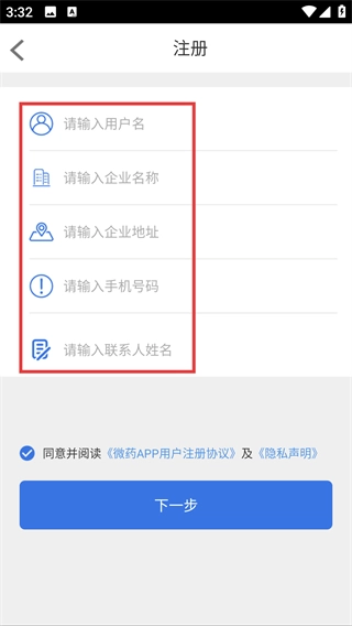 3、在注冊頁面填寫用戶名、企業(yè)名稱、企業(yè)地址、手機號碼和聯(lián)系人姓名。