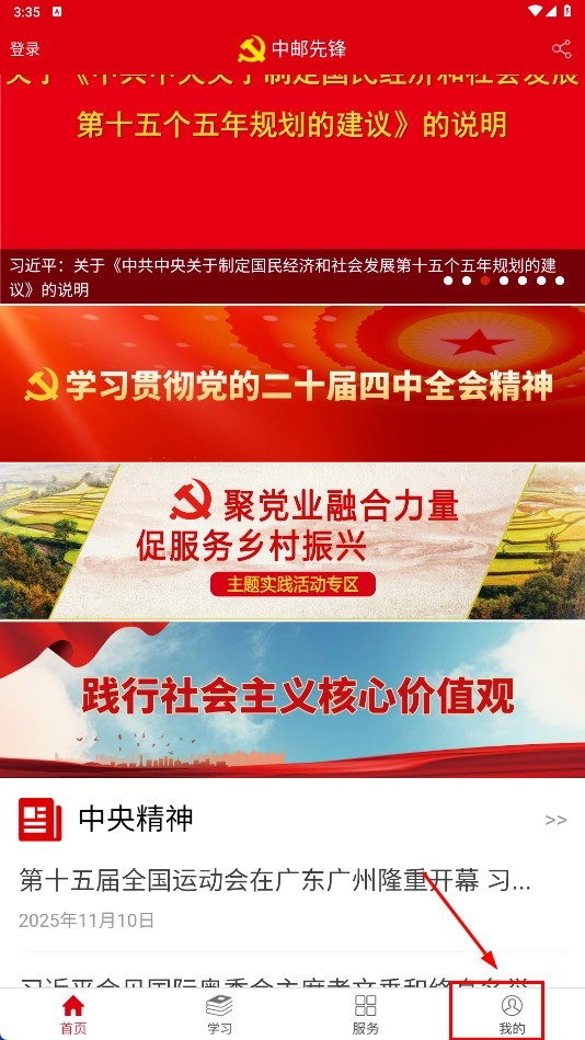 1、在【中郵先鋒】首頁,點(diǎn)擊底部的【我的】選項(xiàng),就能進(jìn)入個人相關(guān)操作界面,比如登錄之類的操作都可以在這里進(jìn)行。