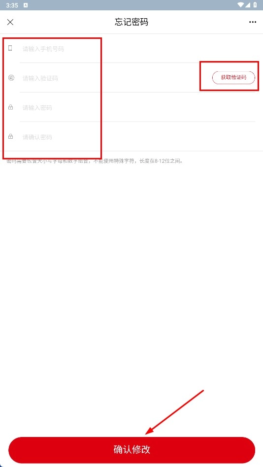 3、在忘記密碼頁,依次輸入【手機(jī)號】、【驗(yàn)證碼】、【密碼】、【確認(rèn)密碼】,點(diǎn)擊【獲取驗(yàn)證碼】后,點(diǎn)【確認(rèn)修改】。
