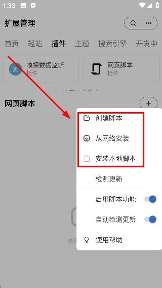 4、在腳本添加選項列表中可選擇【創(chuàng)建腳本】【從網絡安裝】【安裝本地腳本】等操作,完成網頁腳本的添加或創(chuàng)建操作。