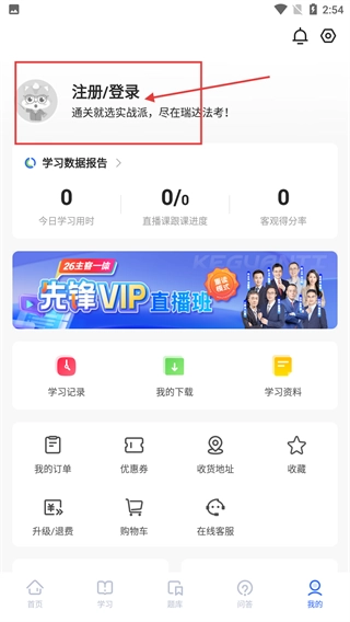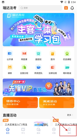 進(jìn)入瑞達(dá)法考后,點(diǎn)擊右下角的【我的】按鈕,就能進(jìn)入個(gè)人中心頁面。