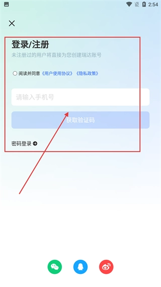 3、在登錄注冊界面,輸入手機(jī)號,點(diǎn)擊【獲取驗(yàn)證碼】按鈕,可進(jìn)行短信驗(yàn)證碼登錄流程。